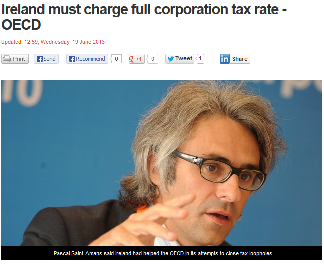 The head of tax at the OECD has today told Ireland that it must charge Corporation Tax at the full 12.5% rate, if we wish to retain our current Corporation Tax regime